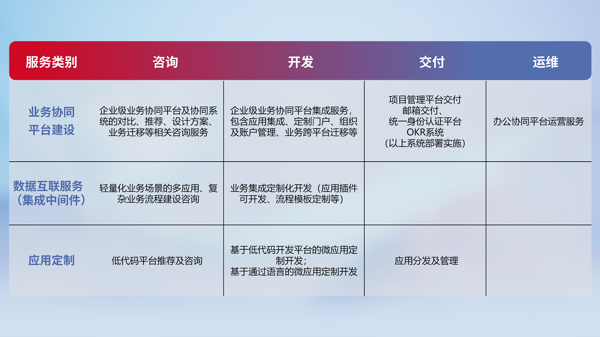 针对钉钉、、、企微、、、IDaas等平台级产品提供产品的规划、、、、方案、、、、交付、、、定制化开发等服务,,,实现如统一协同办公、、、智能客户服务、、、混合会议管理、、、、智能数据查询、、等业务场景,,,实现数字化转型。。。。